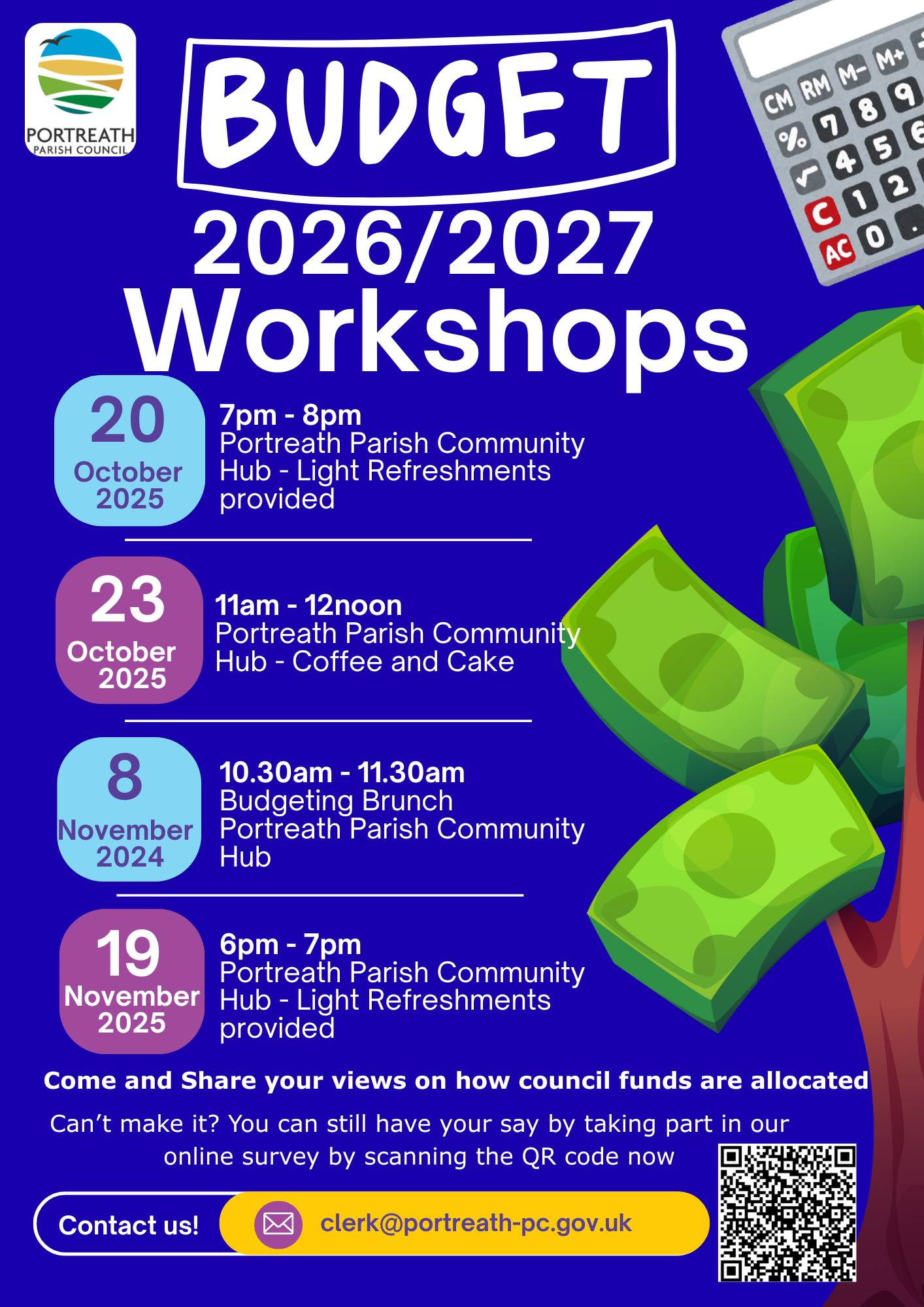 Portreath Parish Council is inviting you to series of Budget Workshops where you can share your ideas on how council funds should be spent in the year ahead. Whether you care about community events, local projects, or village upkeep - your voice matters!